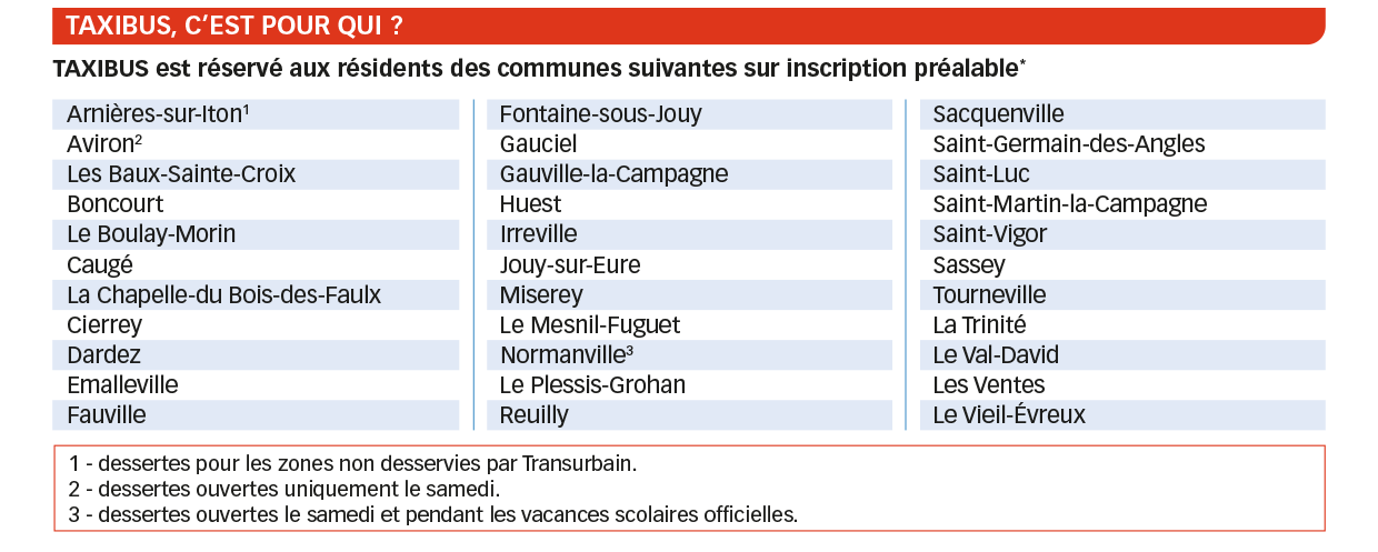 TAXIBUS prend en charge les voyageurs à des arrêts identifiés dans leur commune et les dépose à Évreux, à des points qui leur permettent de prendre une correspondance sur une ligne régulière.